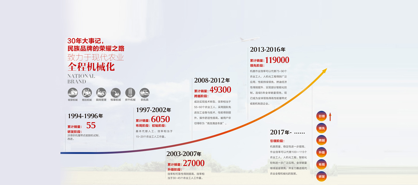 沃得農(nóng)機(jī)隸屬于中國(guó)民營(yíng)企業(yè)500強(qiáng)之一的江蘇沃得集團(tuán),占地面積3000余畝,員工8000余人,2016年實(shí)現(xiàn)銷(xiāo)售70億元人民幣,是一家集研發(fā)、生產(chǎn)、銷(xiāo)售、服務(wù)于一體的大型現(xiàn)代化農(nóng)機(jī)裝備制造企業(yè)。沃得農(nóng)機(jī)立足水田,致力于現(xiàn)代農(nóng)業(yè)全程機(jī)械化,歷經(jīng)近30年發(fā)展,產(chǎn)品形成以耕-種-田間管理-收獲-秸稈綜合利用-糧食后處理全系列產(chǎn)品線(xiàn)。依托優(yōu)質(zhì)的產(chǎn)品和誠(chéng)信的服務(wù),公司產(chǎn)品暢銷(xiāo)全國(guó)28個(gè)省市自治區(qū),出口至世界38個(gè)國(guó)家和地區(qū)。